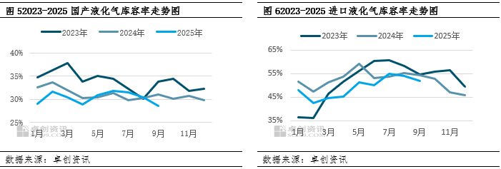 卓创资讯统计数据显示,截至9月18日,国产LPG炼厂平均库容率为28.85%,较上周四升高0.53个百分点。从“2023-2025国产液化气库容率走势图”能清晰看到,与2023年及2024年同期库存水平相比,2025年9月国产气库存处于中下位置。炼厂这种低库存的状态,能够在一定程度上给予市场价格上行的支撑力量。