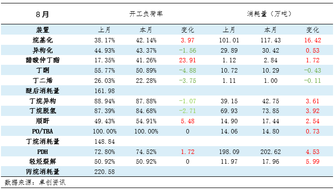 8月国内LPG下游装置需求呈多装置带动、整体提升态势。烷基化装置开工负荷率从38.17%升至42.14%,涨幅3.97个百分点,对LPG需求显著增长。丁烷异构、丁烷脱氢、顺酐、PDH及轻烃裂解装置也表现亮眼。虽异构化、丁酮、丁二烯等装置开工负荷率下滑,对需求有一定压制,但多数主要下游装置需求提升,推动下游市场需求总量积极增长。以丙烷为例,本周PDH装置开工率提升,化工需求偏强,北方燃烧刚需随气温回落也有增强,下游采购积极。同时,国际原油走势偏强支撑市场心态,且业者因未来需求增量预期对后市有信心,也支撑当前市场价格。