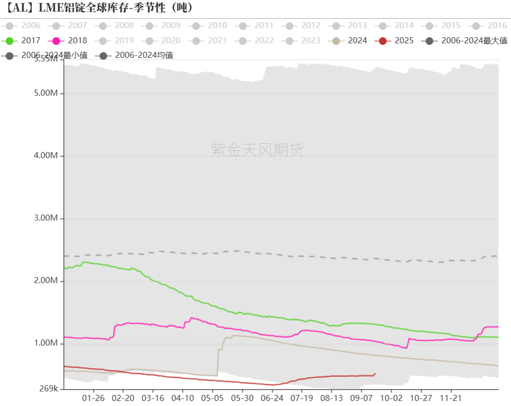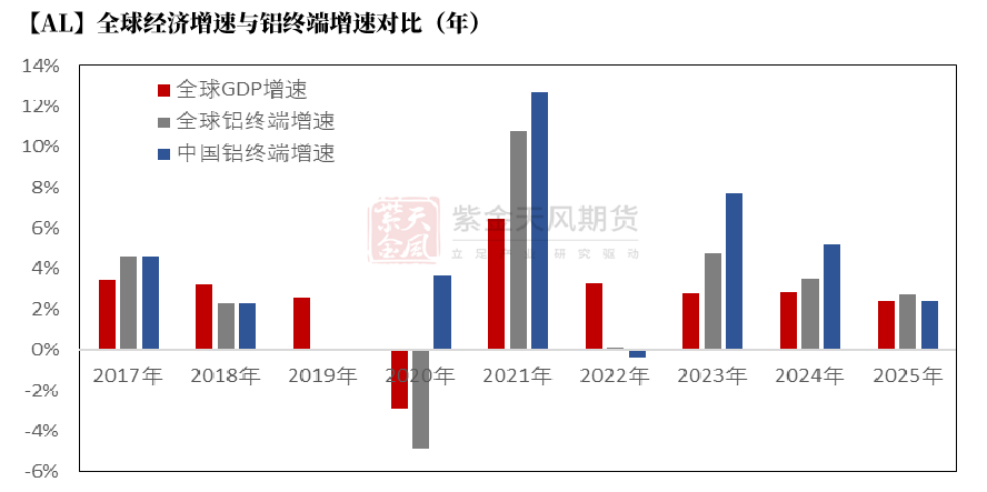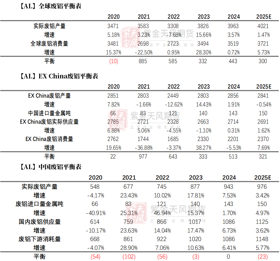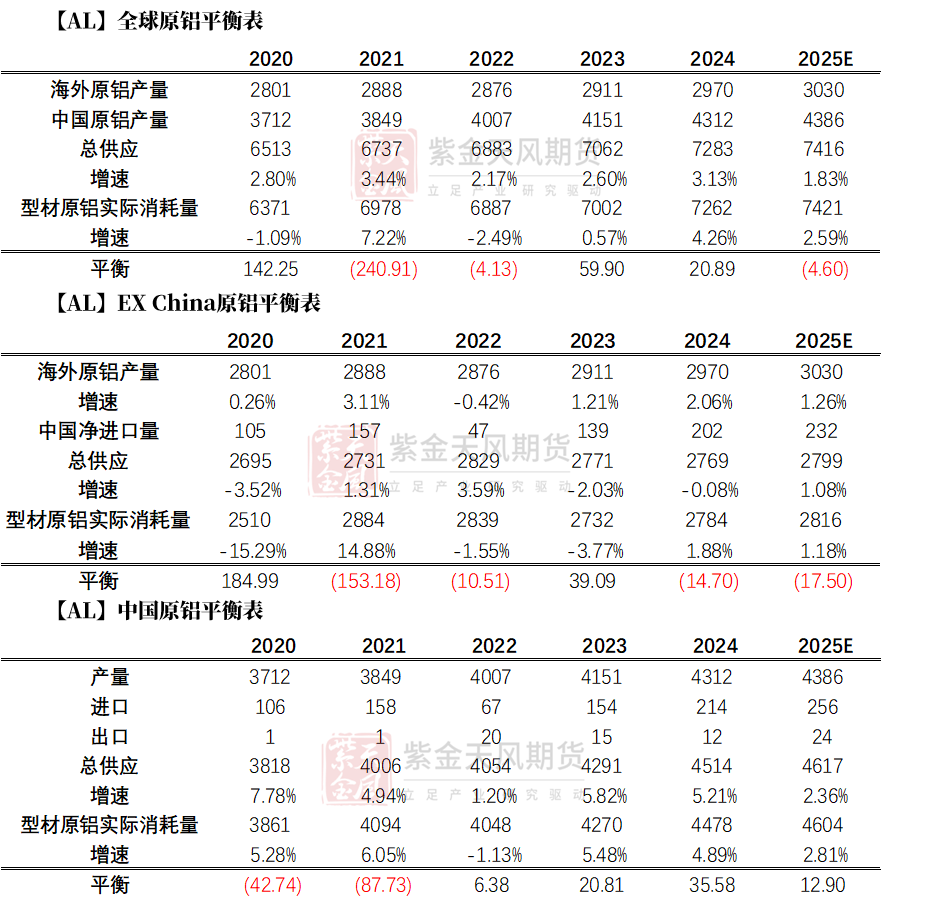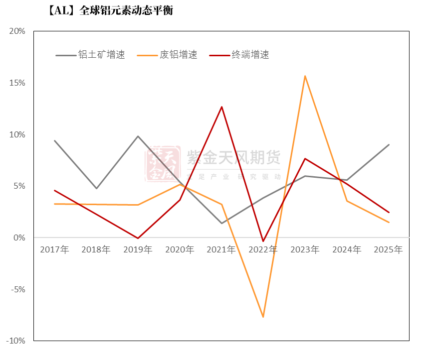 从近年铝元素动态平衡来看,2025年铝土矿、废铝、终端消费三大增速的排列与2022年相同。但是当年LME铝价下滑15%,沪铝下跌8%左右,显然与今年的铝价走势不一致。