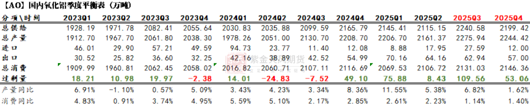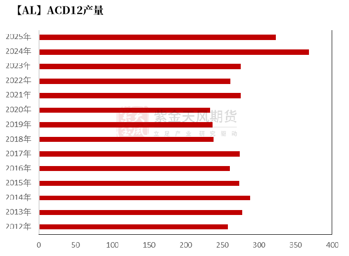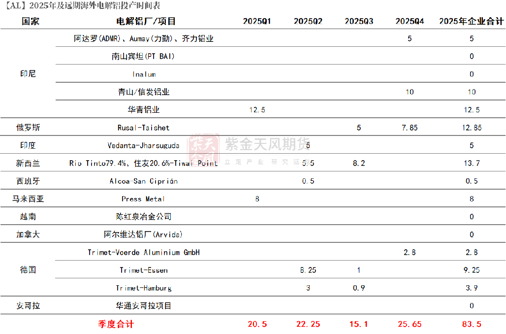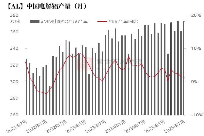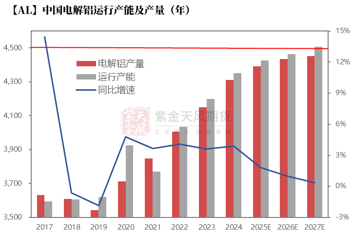 从最新国内铝厂运行产能来看,预计2025年国内电解铝产量在4385.8万吨,同比增速1.7%。