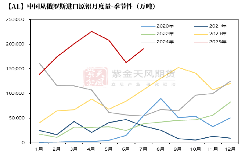 今年我国与俄铝签订了220万吨的电解铝进口长单。2025年1-7月,俄罗斯已向我国输入原铝139.25万吨,累计同比93.41%,在我国进口总量比重已超86%。预计在俄被制裁持续期内将继续作为我国核心供应来源。