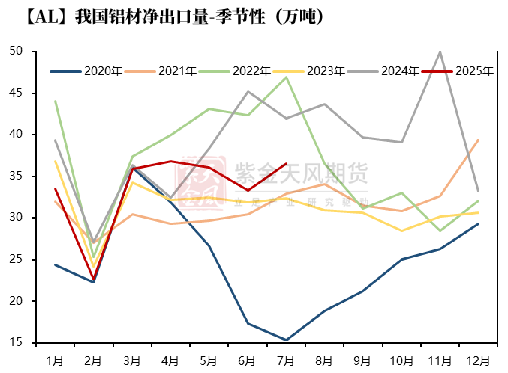 今年以来我国铝材出口面临国内外的双重政策压力。国内自2024年12月1日起取消铝材出口退税,美国自2025年3月多次调整对中国铝材的进口关税政策。当前美国发起的贸易战仍未结束,但对铝材出口的边际影响已逐步衰减,我国铝材出口韧性较强。2025年1-7月,我国累计出口铝材录得234.71万吨,同比-9.95%。出口量由高到低分别为墨西哥、印度、越南、泰国、韩国等。