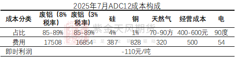 2025年7月,国产ADC12行业加权平均完全成本19584元/吨(含税),与2024年同期相比,成本降低60元/吨,按照ADC12平均售价19474元/吨计算,理论利润为-110元/吨。