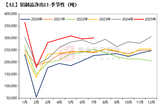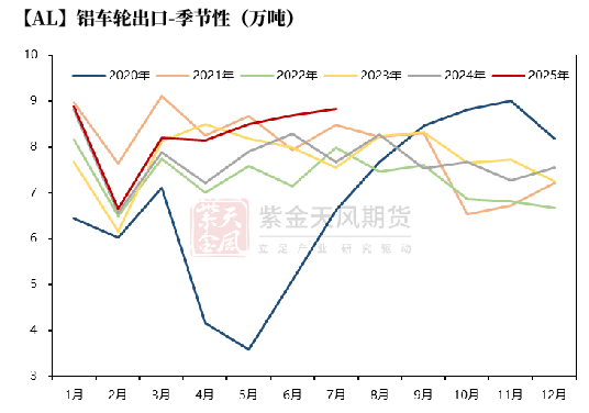 今年铝制品、铝车轮出口表现相当亮眼。相较铝材,铝制品和铝车轮遭受的贸易制裁程度较小,铝车轮自6月以来甚至逆季节性增长。这表明我国出口退税政策有效推动了出口结构由传统铝材向更高附加值的铝制品转变。2025年1-7月,我国累计出口铝制品录得202.38万吨,同比增长11.40%。其中向美国累计出口25.3万吨,同比下降18.5%;向澳大利亚累计出口11.7万吨,同比上升18.0%。同期,铝制轮毂累计出口录得57.9万吨,同比6.55%。可见,在对美出口暴跌的背景下,铝制品通过对其他市场的拓展仍实现了正增长。