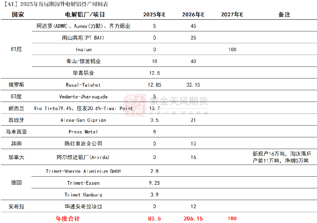 从排产情况来看,海外电解铝新增产能有限。近三年海外规划投产380.6万吨,其中2026年计划投产较多。这也意味着海外电解铝产量将在2026年达到峰值。