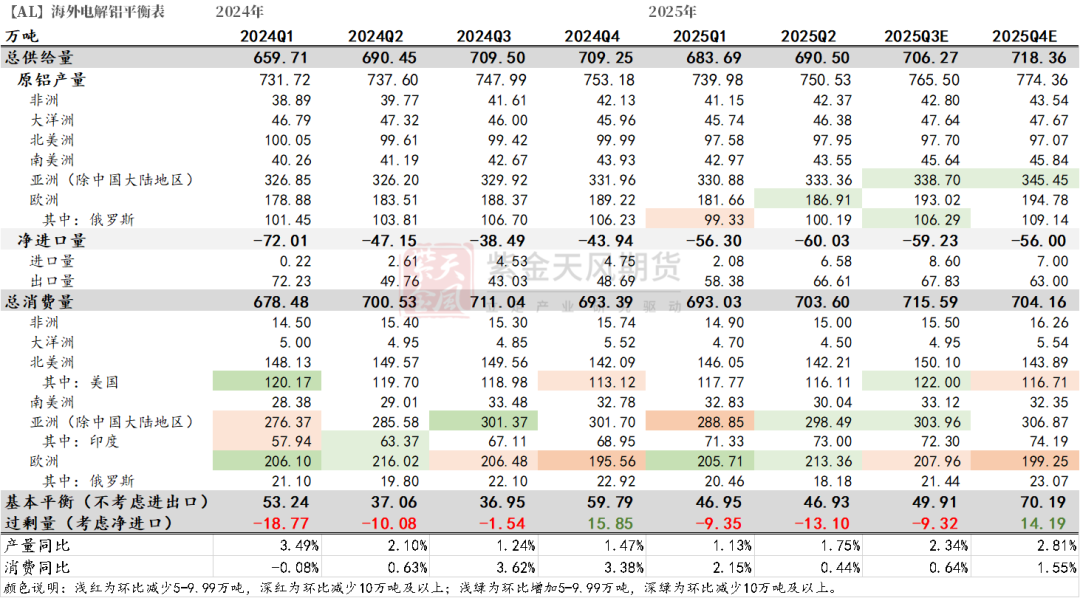 2025年,海外电解铝的增量主要来自印尼、新西兰、俄铝。预计全年产量3030.37万吨,同比2.02%。