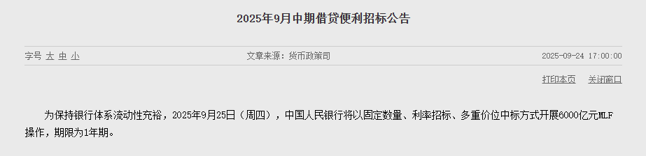 【大河财立方消息】9月24日,中国人民银行发布公告称,为保持银行体系流动性充裕,9月25日将以固定数量、利率招标、多重价位中标方式开展6000亿元MLF操作,期限为1年期。