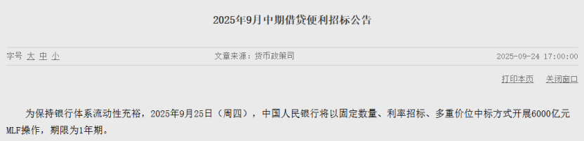 为保持银行体系流动性充裕,中国人民银行(以下简称“央行”)9月24日发布预告称,将在25日以固定数量、利率招标、多重价位中标方式开展6000亿元中期借贷便利(MLF)操作,期限为1年期。鉴于9月有3000亿元MLF到期,本月央行MLF净投放将达到3000亿元,为央行连续第七个月对MLF加量续作。