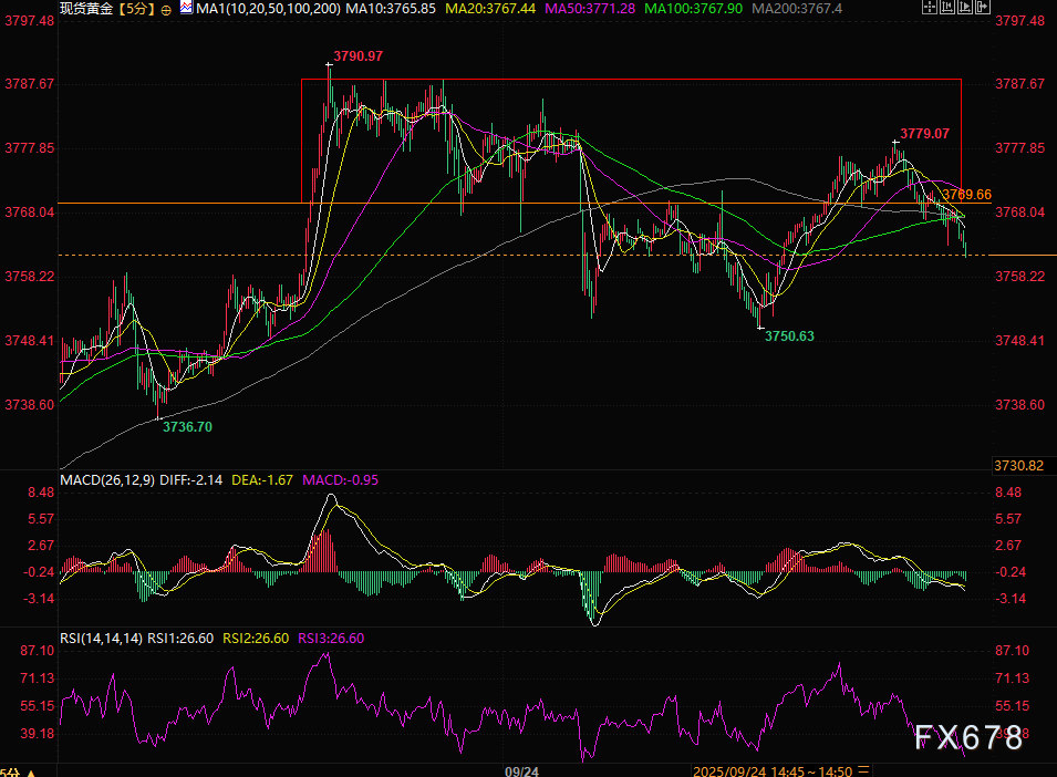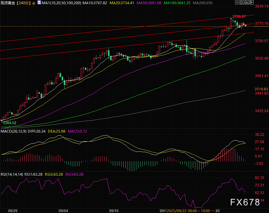 汇通财经APP讯——周三亚欧时段,现货黄金宽幅震荡,目前持平,交投于3764.80附近,亚市早盘金价受美联储主席杰罗姆·鲍威尔就潜在降息发表谨慎言论后开盘下探15美金至3750政治关口,之后受到港股A股超预期单边上涨提振了风险偏好,黄金大幅反弹接近30美金,最高涨至3779。目前受美元指数日内走高0.5%影响,黄金涨幅收窄,但金价仍连续第四个交易日维持看涨基调。