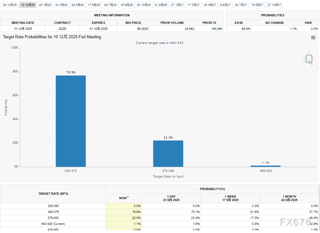 交易员预期,在本月初美联储实施25个基点降息后,10月与12月还将再度下调借贷成本。这一预期推动无息资产黄金在周三亚洲交易时段吸引部分逢低买盘。
