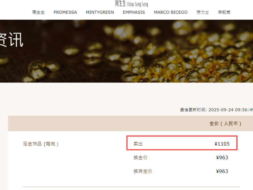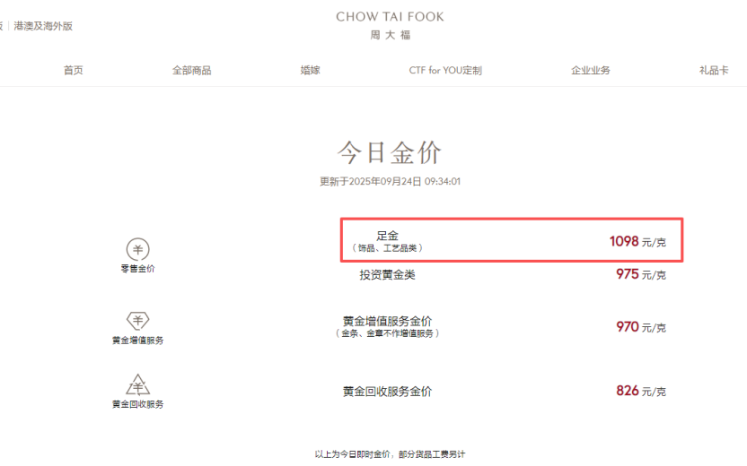 另一家知名黄金珠宝品牌周大福官网数据显示,9月24日其足金(饰品、工艺品类)价格也已逼近1100元/克,为1098元/克。