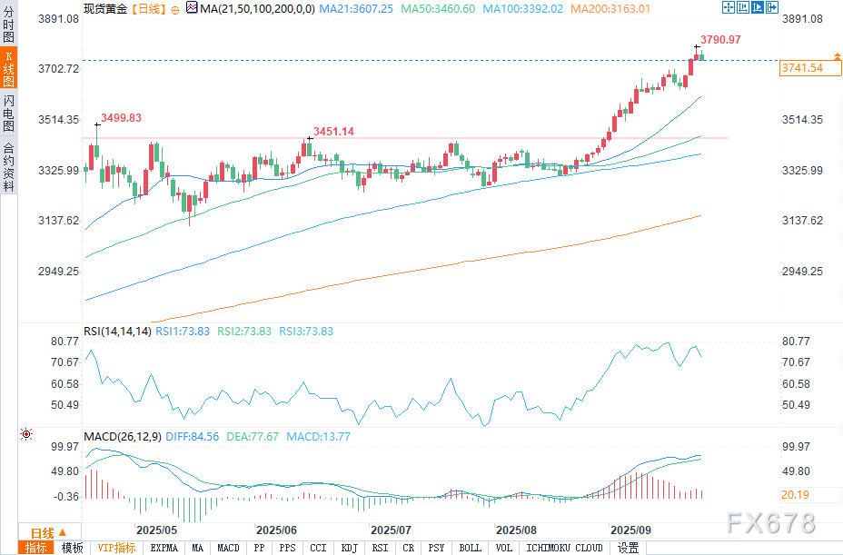 现货黄金在创下3791美元的新历史高点后,进入盘整阶段,截至目前多头成功守住3750美元关口。尽管整体看涨格局未变,但动能指标已显现初步疲弱迹象,表明市场在经历一轮过度上涨后,正消化近期涨幅。