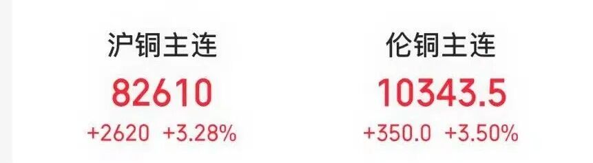 商品方面,全球铜价大幅上涨。伦铜价格涨3.50%,创2024年6月以来最高水平;沪铜价格涨超3%。