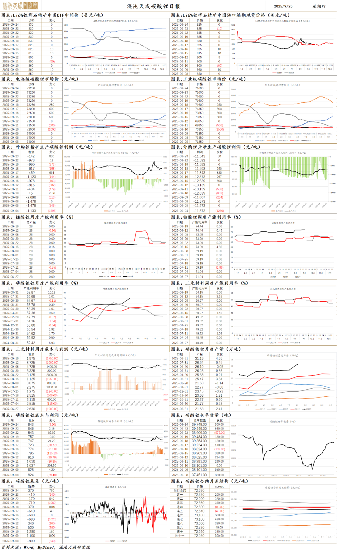 1、【8月碳酸锂产量下降,氢氧化锂产量下降】受宁德时代旗下枧下窝锂矿停产影响,以锂云母为原料生产的碳酸锂产量下降。据中国有色金属工业协会锂业分会统计,2025年8月,全国碳酸锂产量约6.5万吨,环比下降10.9%;全国氢氧化锂产量约3.1万吨,环比下降7.6%。全国锂盐产量折合碳酸锂当量(LCE)约9.2万吨,环比下降10.0%。锂盐产量区域集中度较高,8月,我国碳酸锂产量主要集中在江西、四川、青海,产量分别为1.8万吨、1.7万吨、1.1万吨;氢氧化锂产量主要集中在四川、江西,产量分别为1.1万吨、1.4万吨。(锂业分会)