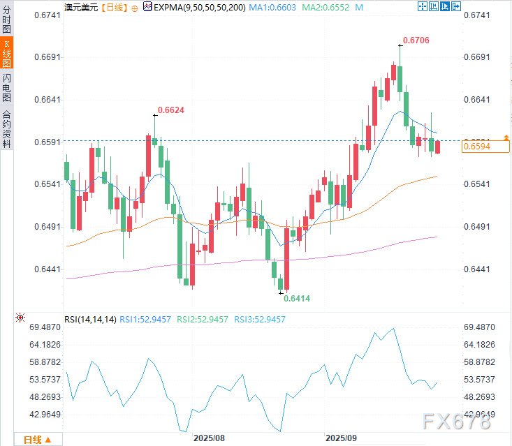 日线图技术分析显示,澳元兑美元目前位于九日指数移动平均线(EMA,0.6603)下方,表明短期价格动能偏弱。