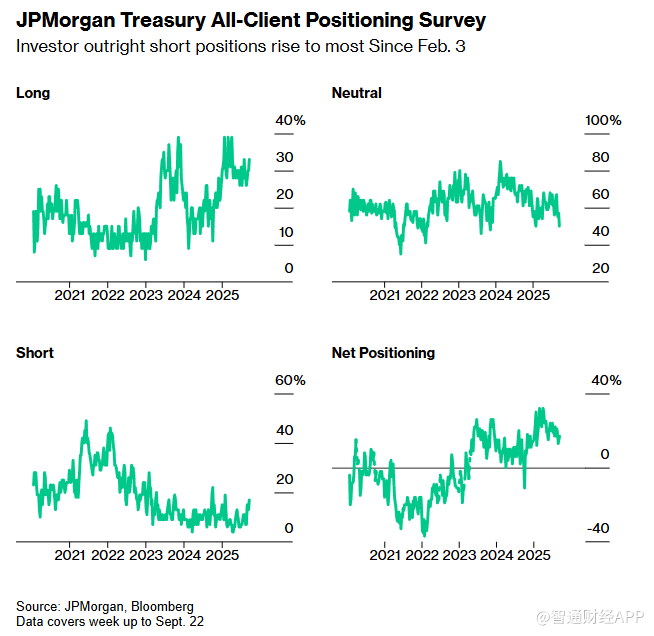 摩根大通美国国债客户调查显示,截至9月22日当周,投资者空头仓位上升4个百分点,达到2月初以来的最高水平。多头仓位也有所上升,而中性仓位则下降了7个百分点。
