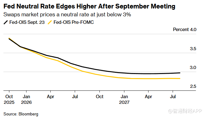 与担保隔夜融资利率挂钩的期权显示,市场参与者押注美联储在2025年仅再降息25个基点,且所谓的中性利率(即既不刺激也不抑制经济增长的利率水平)高于当前市场预期。这与上周形成了鲜明对比,当时市场对年底前降息50个基点的预期升温。