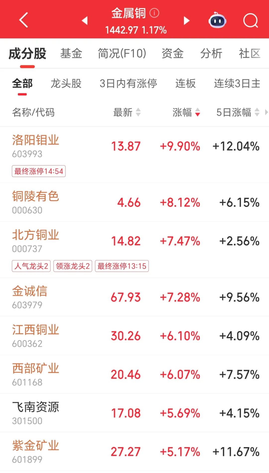 9月25日,沪铜、伦铜主力合约盘中价格创下年内新高。A股公司中,洛阳钼业涨停,北方铜业一度触及涨停,铜陵有色、江西铜业、紫金矿业盘中最大涨幅分别达9.74%、8.31%、6.59%。其中,紫金矿业市值一度飙至全球矿业企业前三。