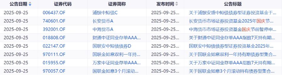 比如,浦银安盛基金9月25日发布关于浦银安盛中短债债券型证券投资基金于2025年国庆节假期前暂停通过部分销售机构的申购、转换转入及定期定额投资业务的公告。内容显示,“浦银中短债A”和“浦银中短债C”自9月29日暂停通过部分销售机构的申购、转换转入及定期定额投资业务,原因说明为保护基金份额持有人的利益,加强基金投资运作的稳定性。