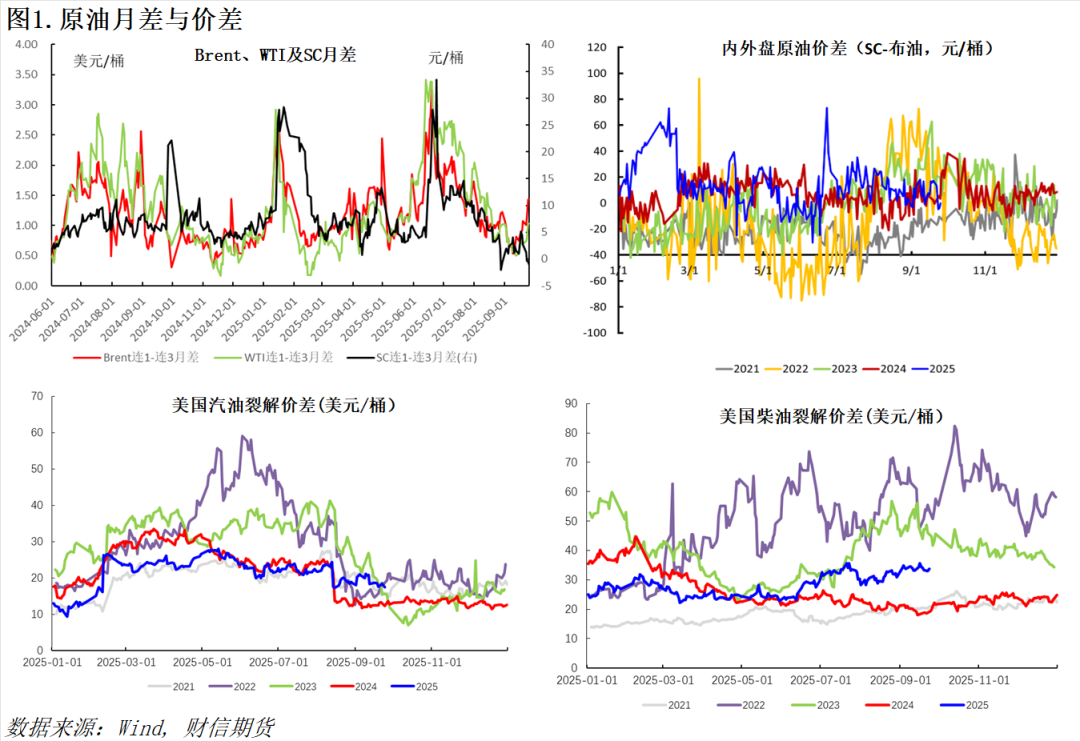 近期,国内外原油价格震荡运行,原油期货月差分化,SC-Brent价差偏弱,现实面相对宽松。