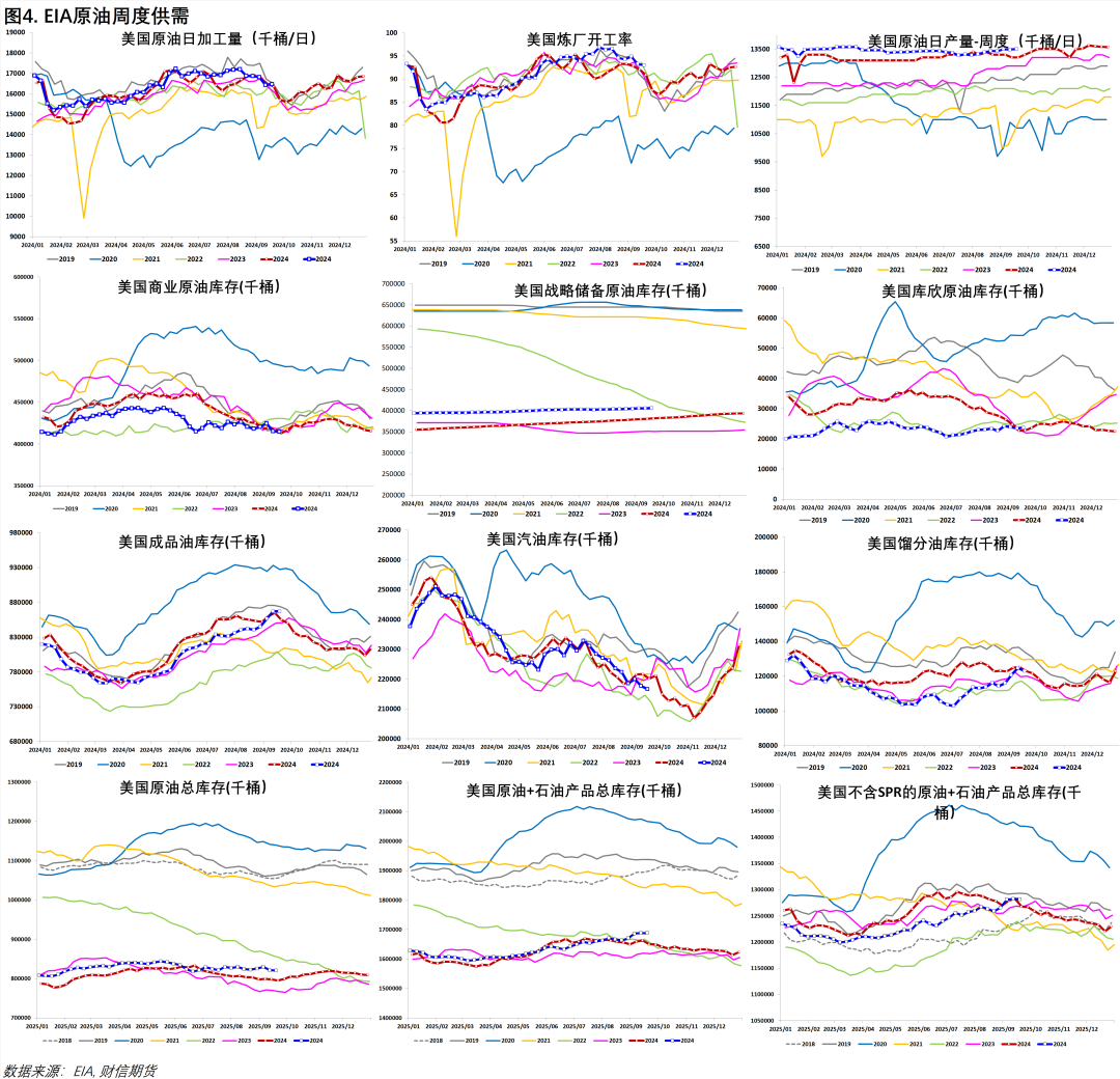 从高频需求来看,EIA数据显示,上周美国炼厂原油输入量增加5.2万桶/日至1647.6万桶/日,炼厂开工率环比减少0.3%至93%。利润相比偏高,开工率下滑速度偏慢。上周美国原油产量1350.1万桶/日,产量稳定。