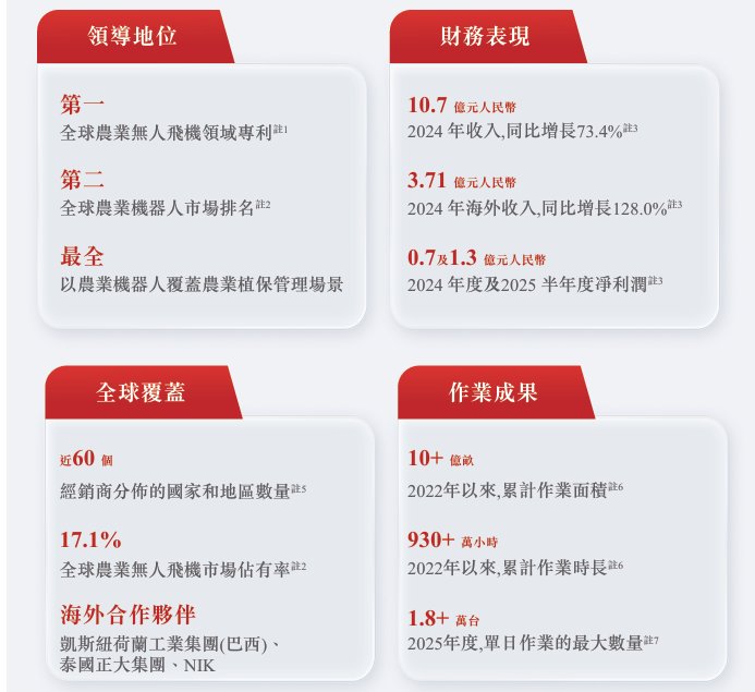 据招股书,极飞科技是一家全球领先的农业机器人公司,以提升农业生产效率为使命。根据弗若斯特沙利文的资料,2024年度该公司以10.7%和17.1%的市占率于世界农业机器人和农业无人飞机行业分别排名第二。通过深度融合先进机器人、智能化、新能源技术,该公司打造了一系列具有高精度作业能力、效率效益远高于人力劳动和传统农机的智能农业机器人,持续通过机器人代人的方式解决世界农业生产最大的需求——无人种地问题,引领产业革命。