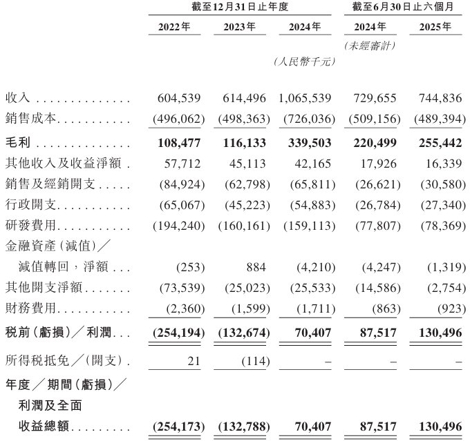 财务方面,于2022年、2023年、2024年及2025年截至6月30日止六个月,该公司实现收入分别约为6.05亿、6.14亿、10.66亿、7.45亿元人民币;同期,年度/期间利润及全面收益总额分别约为-2.54亿、-1.33亿、7040.7万、1.30亿元人民币。