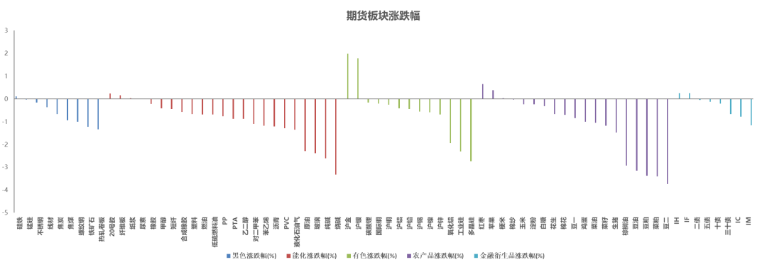 从板块整体表现看,贵金属上涨,能化、农产品多数下跌。
