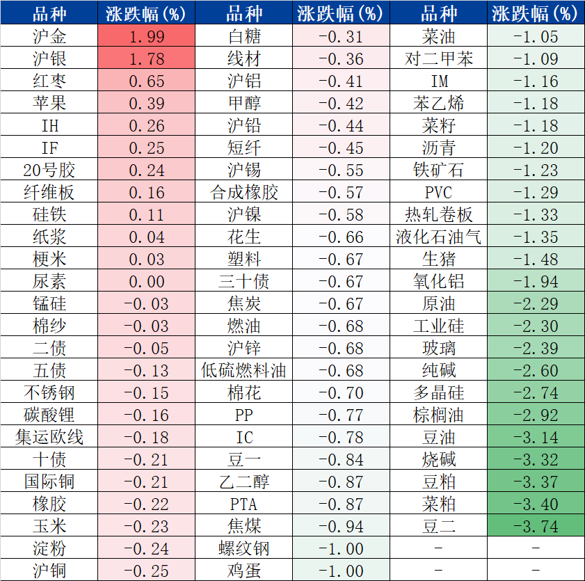 涨幅居前的三个品种分别是沪金、沪银和红枣;跌幅居前的是豆二、菜粕和豆粕。