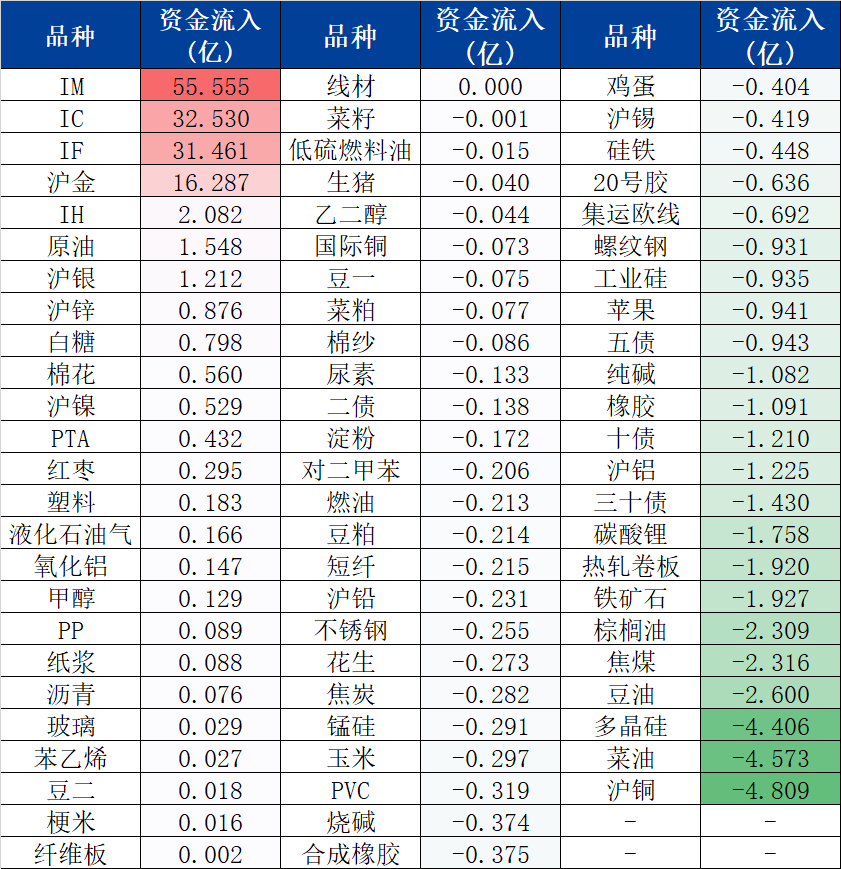 资金流入前三名为IM、IC和IF;流出前三名分别为沪铜、菜油和多晶硅。