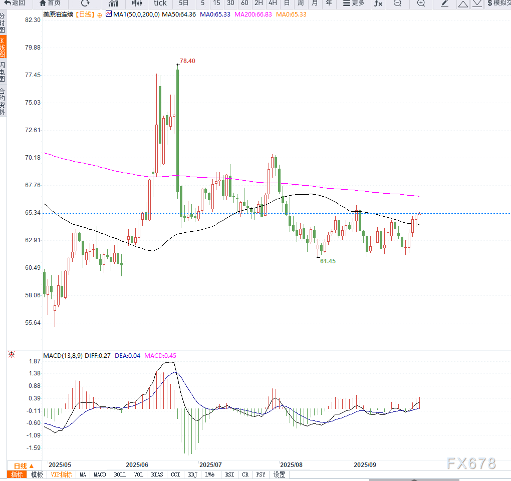 从美原油(WTI)日线图走势来看,价格已突破前期震荡区间上轨,并稳固站上65美元关口,技术面显示多头动能增强。均线系统形成短期金叉形态,MACD指标上行发散,显示上涨趋势仍在延续。
