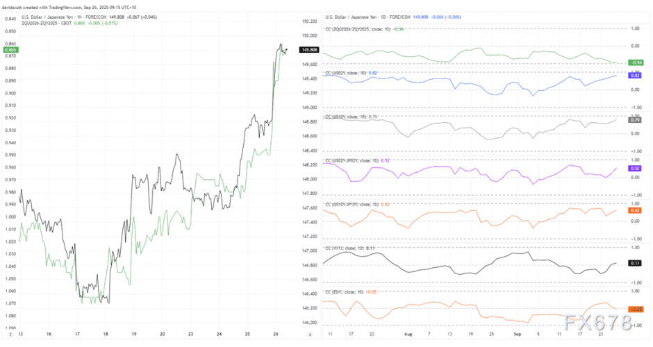 市场对美联储降息的预期定价正在主导美元兑日元的走势。如下图表绿色部分所示,其与2025年10月至2026年9月期间联邦基金期货曲线形态的相关系数高达-0.94。