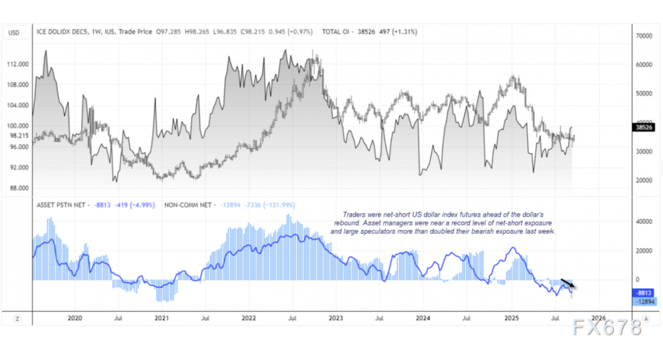 最新的持仓报告(COT)显示,市场在美元指数期货上仍维持净空头布局。大型投机者上周将净空头敞口扩大超一倍,主因大量多头平仓,使看空仓位升至四年高位。资产管理机构的净空头合约亦达-8.8千手,接近历史极值。当前两类群体似乎站错方向——市场正回调美联储降息预期,美元则展开逆势反弹。