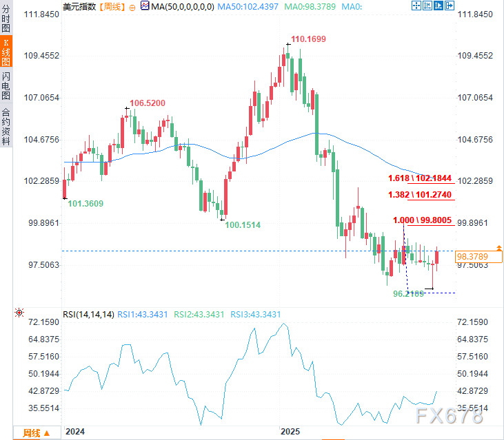 根据波浪理论,b浪后a浪的100%投射位与近期周期高点及50周均线(102.44)汇聚,在100整数关口下方形成阻力密集区。若成功突破该区域,后续或将挑战50周简单移动平均线(102.44)及138.2%斐波那契投射位(102附近)。