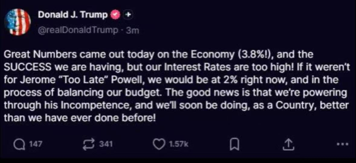 对此,美国总统特朗普在社交媒体发文称:今天公布了很棒的(GDP)经济数据(3.8%),我们取得了成功,但是利率太高了!如果不是鲍威尔,我们现在的利率应该是2%,并且正在实现预算平衡。好消息是我们正在克服他的无能,作为一个国家,我们很快就会做得比以往任何时候都好!