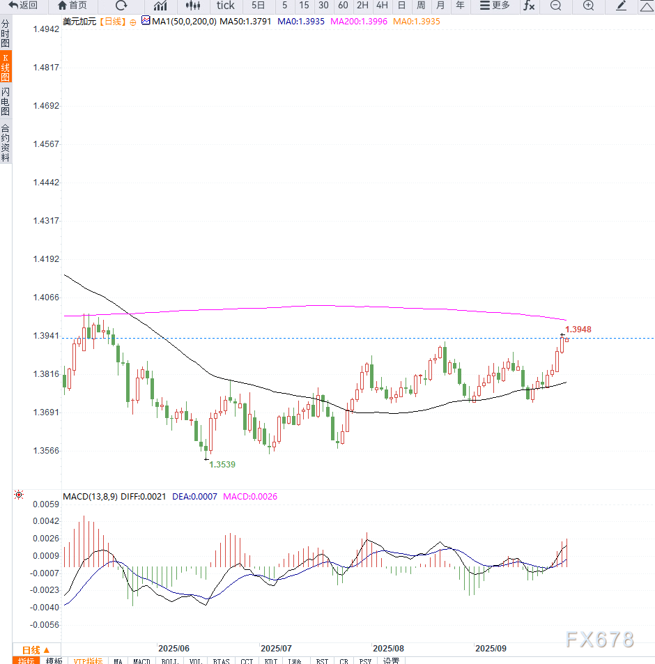 从日线图来看,USD/CAD自9月以来持续上行,目前已突破1.3900关键阻力位,并刷新四个月高点。短期均线呈现多头排列,MACD指标保持正向扩散,显示多头趋势占优。