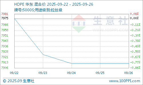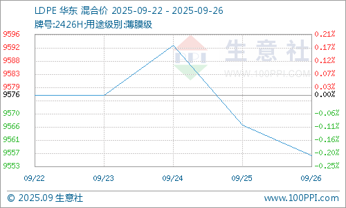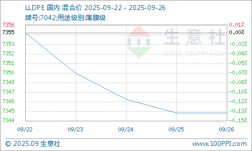据生意社商品行情分析系统监测,LLDPE(7042)9月22日均价7355元/吨,9月26日均价在7345元/吨,下跌0.14%。LDPE(2426H)9月22日均价9576元/吨,9月26日均价在9556元/吨,下跌0.21%。HDPE(2426H)9月22日均价7975元/吨,9月26日均价在7912元/吨,下跌0.78%。