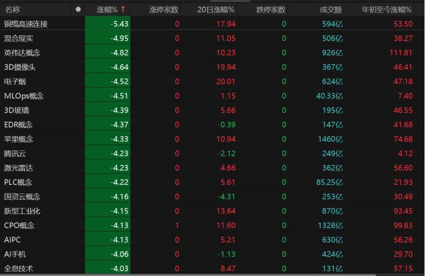 铜缆高速连接、英伟达概念、苹果概念、CPO概念、AI手机等概念板块跌幅均超过4%。