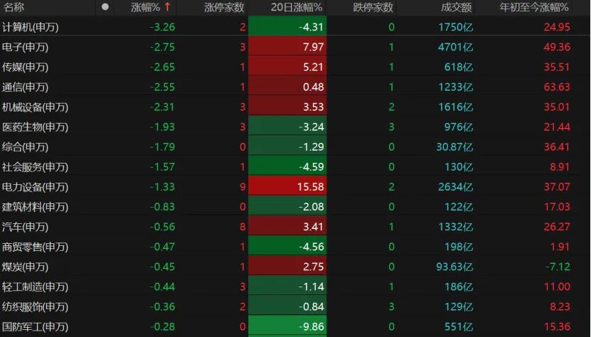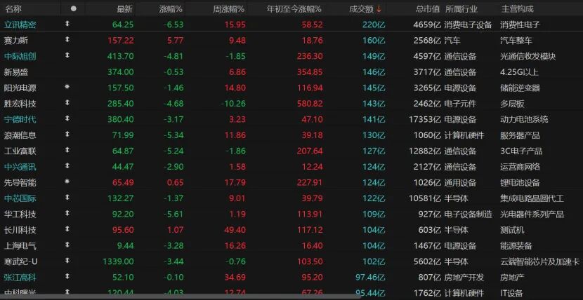 个股跌多涨少,3414只个股收跌,跌停股24只;1805只个股收涨,涨停股58只。日成交百亿俱乐部几乎被消费电子、通信、电子元件、计算机硬件、半导体包揽,却多数收跌,资金高位兑现迹象明显。