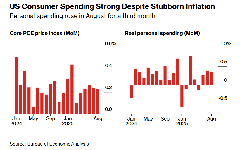 整体PCE通胀指标方面,8月份整体PCE环比增长0.3%,与经济学家普遍预期一致,略高于前值0.2%环比增幅;8月份的整体PCE同比则增长2.7%,与经济学家普遍预期一致,与前值2.6%相比则小幅升温。这组消费者支出上行+PCE符合预期曲线+GDP上修的组合,确实提高了“金发姑娘”宏观情境的主观概率:即增长不弱、通胀不过热、市场预期更“偏向降息”的低利率轨迹。