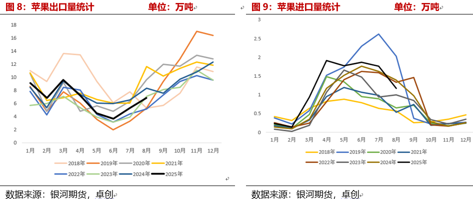 苹果进口:8、9月份国内有大量的夏秋季水果上市,此外国内早熟苹果也都上市,因此苹果进口量下降。根据海关数据,2025年8月鲜苹果进口量1.18万吨,环比减少33.3%,同比减少15.3%。2025年1-8月累计进口量9.84万吨,同比增加22%。9、10月份国内苹果开始大量上市预计苹果进口量将持续减少。