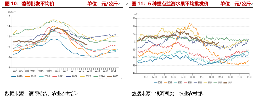 葡萄批发平均价:9月份葡萄开始大量上市,短期内对苹果形成一定的替代。今年葡萄的价格处于历年同期的中位,最近随着陆续上市价格有所回落。根据农业农村部数据,我国西瓜批发平均价格已经跌至10.49元/公斤附近,较4周前价格回落0.67元/公斤,10月份仍是葡萄供应高峰期,预计将继续回落。
