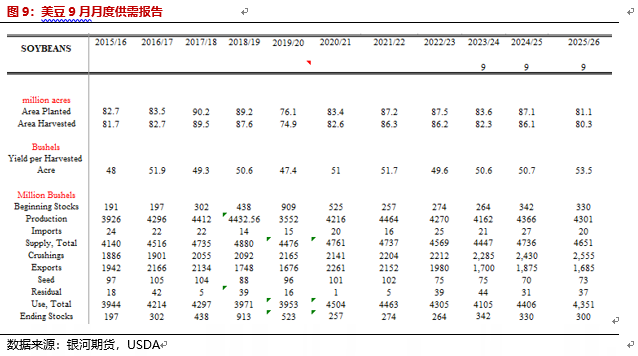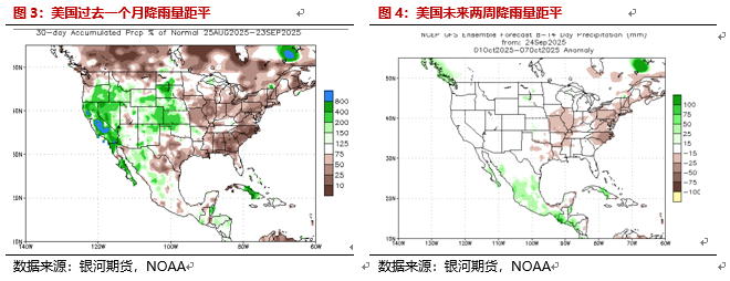 本月以来,美豆开启新作收获,根据美国农业部最新公布的作物生长进度数据,截止9月21日当周,美豆收获进度达到9%,虽然收获相对较早,但推进速度相对偏慢,主要因过去一周中产区降雨量有明显增加,初期作物压力相对有限。美豆作物优良率近期呈现明显下行状态,在过去一周中,美豆优良率已经下降至61%左右,处于历史同期相对偏低水平。可以看到,本月以来,美国产区天气一直以偏干为主,降雨量处于历史同期偏低水平,仅过去一周中降雨量有所改善。从近期气象模型来看,未来两周降雨量继续处于历史同期偏低水平,一定程度有利于作物收获推进,但优良率水平可能继续偏低。月度供需报告将美豆单产进行小幅下调,但整体仍然维持在53.5蒲式耳/英亩的较高水平,如果后续作物继续受影响,预计作物单产可能呈现进一步下滑,本次月度供需报告预计继续下调美豆单产。