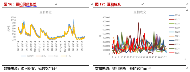 本月以来,豆粕现货市场仍然缺乏强驱动。截止9月26日,各地区豆粕现货基差普遍上涨20-80元/吨,其中华东地区压力相对较大,华南地区基差反弹较明显。近期现货基差走强一方面因为盘面下跌较多,另一方面也因为后期开机率整体有所下降,但在供应压力较大的背景下,现货仍然表现出比较明显的压力。市场成交仍然缺乏增量,数据显示,预计月内豆粕现货总成交量日均维持在15万吨左右,较上月下滑明显,其中现货日均成交量8.9万吨,环比小幅增加,基差成交量6万吨,环比下降8万吨。盘面大幅回落后,现货成交有所改善,但由于前期卖货较快同时现货方面持续承压,远期基差明显下滑,从市场情况来看,近期巴西新作卖货数量有所增加,市场有布局表现。10-11月价格普遍偏低,华南地区以-10-30为主,市场少量布局。随着近期国内买船数量的增加,后续供应紧张担忧明显减少,盘面月间价差有所回落,其中11-1月间价差整体在-46至-18区间震荡,盘面15价差则一度跌破+200一线。