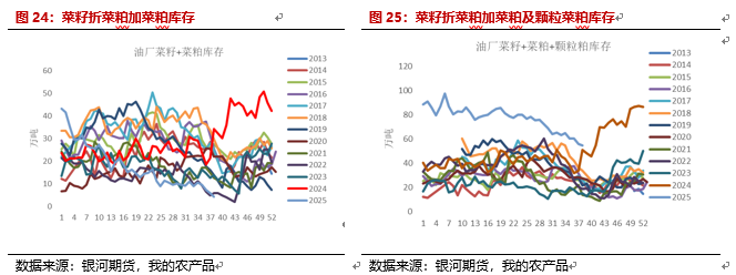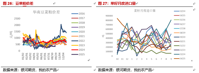 总体来看,随着国内对于进口菜籽以及菜粕的限制,后续供应端可能呈现明显减少。未来一段时间菜籽到港量处于绝对低位,当前国内菜籽库存较低,我的农产品口径数量在4.6万吨左右,预计后续压榨量可能进一步下滑。进口菜粕可能相对比较充足,一方面因为后续仍有一定进口量,另一方面由于当前国内库存仍然维持高位。因此后续供应整体主要集中于进口菜粕。需求方面来看,当前豆菜粕价差维持低位,并且后续菜粕需求也开始呈现明显减少,因此总体菜粕需求表现可能比较一般。在此背景下,预计菜粕供需均缺乏驱动。