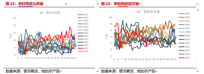 供应端来看,根据我的农产品数据显示,预计月内菜籽到港量在3条船左右,周度高频数据显示,月内菜籽压榨量大约在18万吨左右,总体供应仍然相对充足。需求方面来看,当前国内菜粕提货量基本维持正常水平,预计月内压榨菜粕提货量仍将维持在10万吨左右,随着当前国内菜籽及菜粕库存降至低位,后续市场供需整体将明显收紧。颗粒菜粕方面来看,由于当前国内颗粒菜粕库存量维持高位,因此整体颗粒菜粕提货量也相对较高,货源供应整体充足。