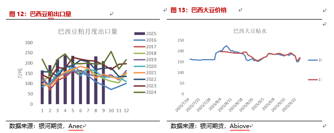 巴西旧作供应仍然比较充足,根据CONAB公布的月度供需报告,本月巴西大豆旧作产量上调至1.71亿吨,较上月继续上调200万吨。整体压榨增速虽然较快,但仍然难以完全承接国内过剩供应。巴西8月压榨数据尚未公布,根据巴西油籽协会数据显示,巴西7月大豆压榨量在520万吨左右,增速较前期持平,仍然维持在相对高位。8月期间压榨量预计继续维持增加态势,一方面因巴西将从8月份开始推动生柴计划的执行,另一方面也因巴西8月份豆粕出口维持高位。巴西在本月内压榨方面变化不大,预计压榨量仍然维持高位。出口方面来看,巴西9月份大豆出口量预计维持在715万吨左右,整体增加量继续增加,巴西出口量的增加主要因对于美豆出口空间挤占较多。总体来看,月内巴西大豆市场继续维持较高需求。本月以来,巴西大豆价格整体呈现上涨态势,但震荡明显增加,初期由于农户卖货不积极,市场需求表现良好,价格持续维持偏强运行,但随后在各类因素综合影响下,大豆价格呈现快速回落,价格变化明显加快。