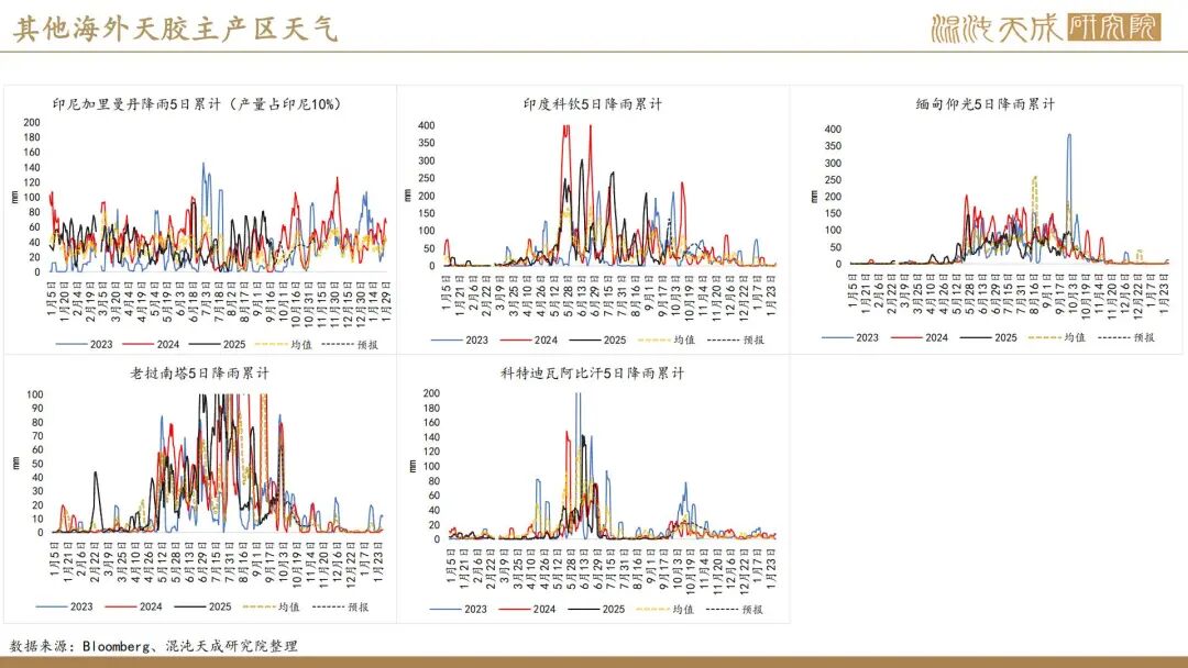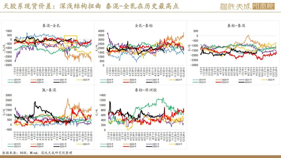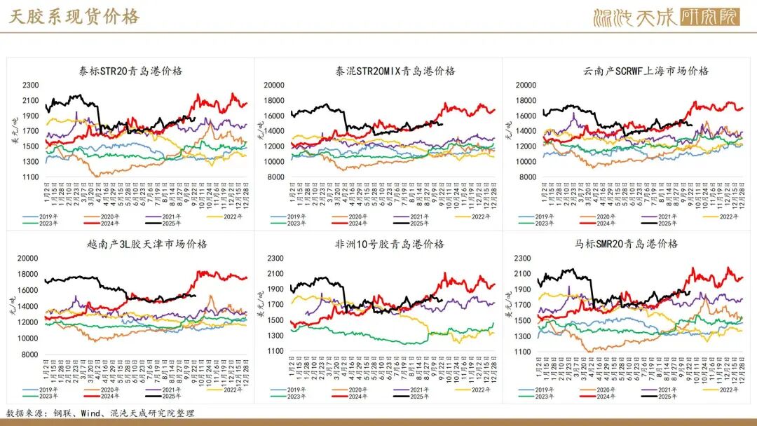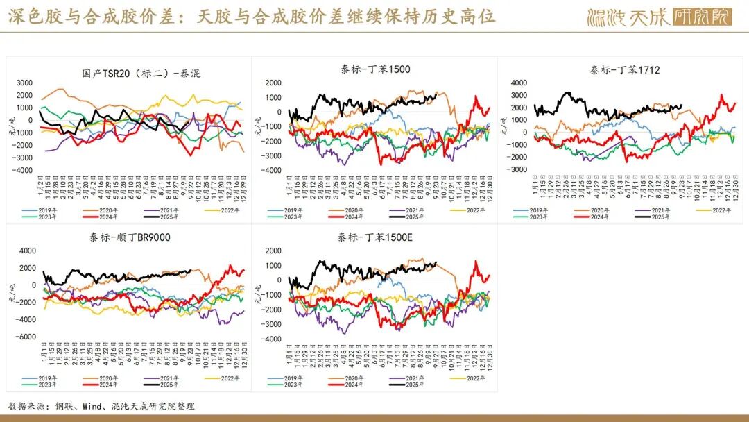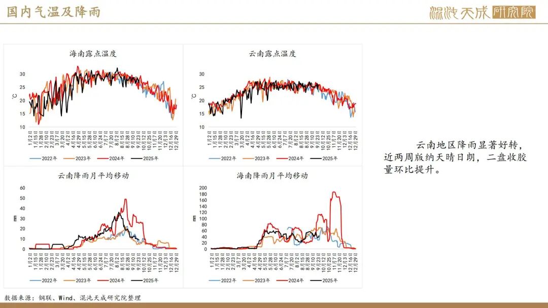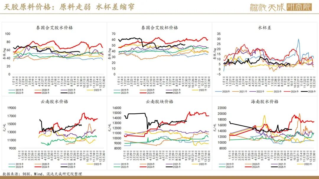 从原料价格表现上看,近期国内外均处于逐步上量的阶段,不过可能还没有显著放量。本周云南二盘反应收胶量环比显著提升,单日满收居多。国外方面,胶水胶杯均有小幅度回落,而胶水跌幅更大,水杯差走弱,或是产区季节性上量开始的一个特征。