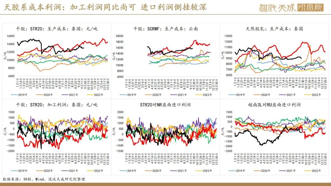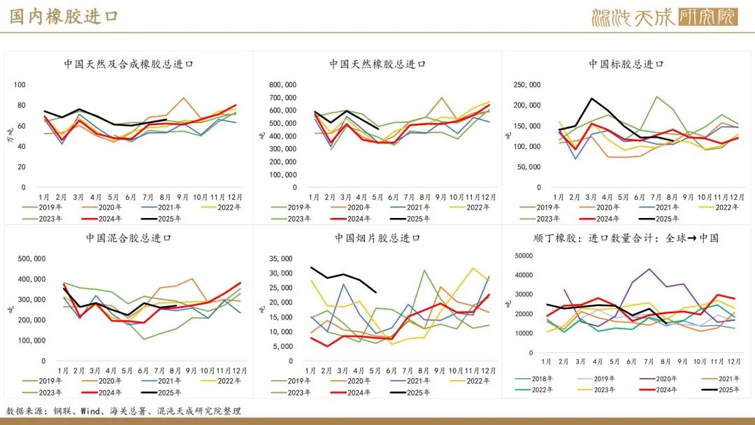 近期供应端主要矛盾在于近月深色现货强势,而后续主产区上量预期明确,主线仍然是强现实弱预期。产生当下供应格局的原因,主要是三季度的天气问题使得泰国过渡期停割居多,原料高企下加工利润较弱,最终产量与出口数据出现同比增幅的收敛甚至回落。直观看出口数据,泰国7、8月份出口量显著回落,结构上维持混合替代标胶的格局:8月泰国混合胶出口13万吨,继续同比高增长,而标混合计出口仅22.9万吨,对比去年同期的28.4万吨同比大幅下降19%;总量上来看,8月泰国天胶混合胶合计出口33.39万吨,同比下降12%;1-8月泰国天胶混合胶合计出口290万吨,同比增长6%(增幅收敛)。