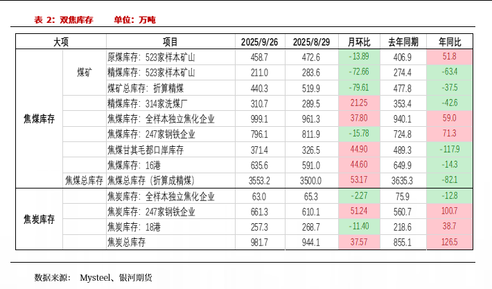 9月初市场情绪一般,下游观望情绪强,上旬焦煤延续延续阴跌,下游焦钢企业去库为主。到了中旬,宏观情绪好转,反内卷情绪回升,盘面上涨,现货情绪改善,同时临近国庆假期,下游焦企和钢厂开始补库,同时也有贸易商入场拿货,煤矿库存去化,下游库存增加,焦煤价格普遍上涨。焦炭方面,供需总体平衡,9月钢厂总体处于缓慢补库的节奏中,库存增加,焦企整体库存变化不大。